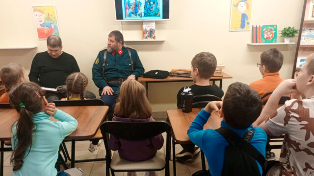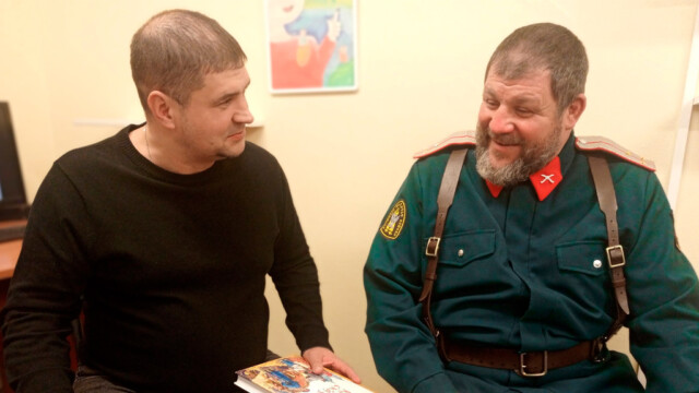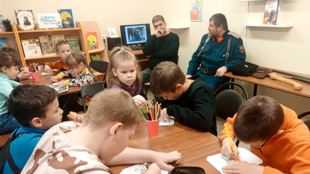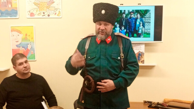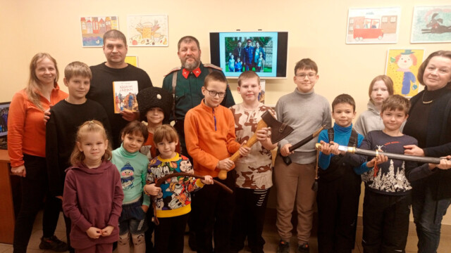 Гостями встречи в библиотеке стали потомок терских и кубанских казаков, атаман Дмитрий Ковбота и Алексей Громов — папа читателей детской библиотеки №12.